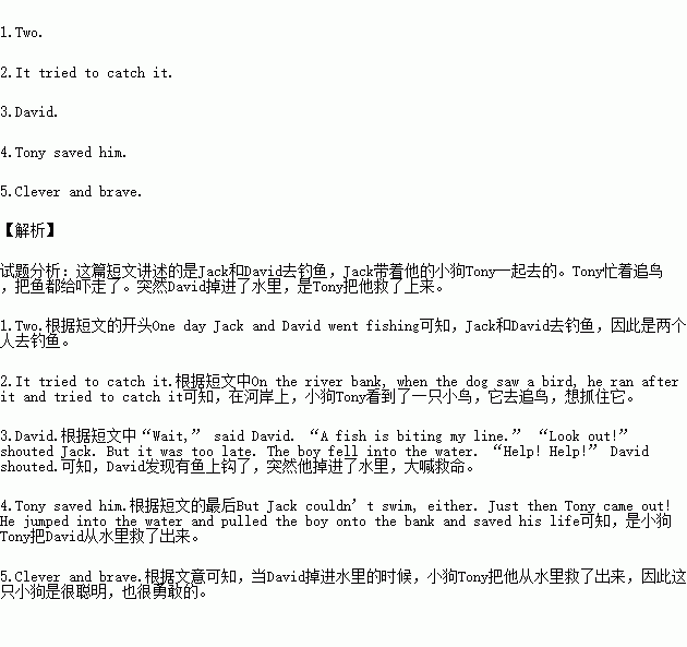 One day Jack and David went fishing. Jack took his dog Tony with him. On the river bank, when the dog saw a bird, he ran after it and tried to catch it. “All the fish are frightened and swim away,” said David. “Be quiet, Tony,” Jack shouted at the dog. But Tony did not listen to him. “Shall we go home now, David?” said Jack. “Next time I shall not bring him here again.”