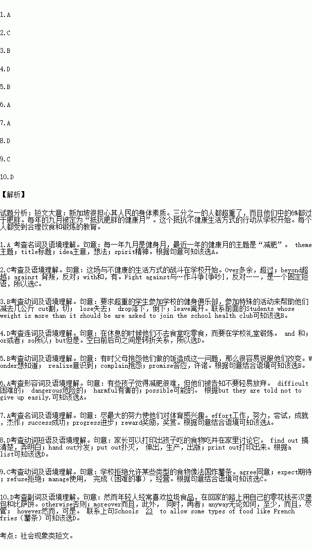 This fight unhealthy lifestyles starts in the schools. Everyone is educated about eating well and taking exercise. Students whose weight is more than it should be are asked to join the school health club and take part in special activities to help them a couple of kilograms. During breaks they do not go to the canteen (餐厅) to eat snacks, to the school hall for some exercise. The school also talks to their parents to see if they can plan a healthier diet for the children. Sometimes the parents it is their cooking that is causing the problem and then it is easy to persuade (说服) them to change. Some children find it to lose weight, but they are told not to give up easily. A big is made to interest them in sport. Fun and games are used to attract the students to running and jumping. One school gives its students a smart student card which they can use to buy books and food. Parents can a list of the food the child is eating and discuss it at home. Fitness classes may be held on Saturdays for those who need them. Parents come and help with ball games and races.