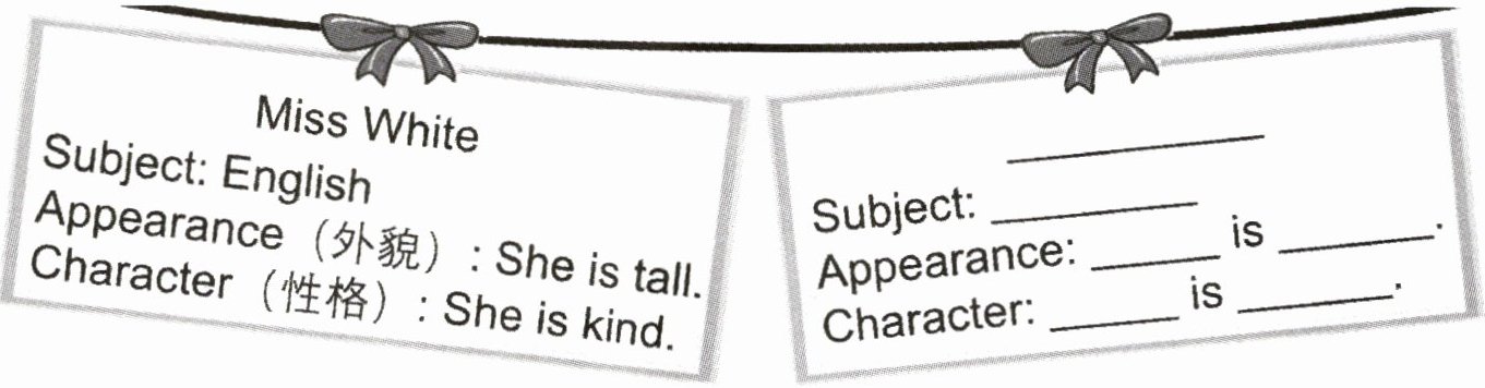 Mr、Miss、Mrs、Ms 四个称呼词的区别:Mr,先生,对男人的称呼;Miss,小姐,是对未婚女性的礼貌称呼;Mrs,太太,对已婚女性的礼貌称呼,后加丈夫姓,如丈夫姓Smith,则称其妻为 Mrs Smith;Ms,女士,通常指不确定是否已婚的女性。四个称呼词后面都跟姓。请同学们仿照范例制作老师的信息卡,注意称呼正确!