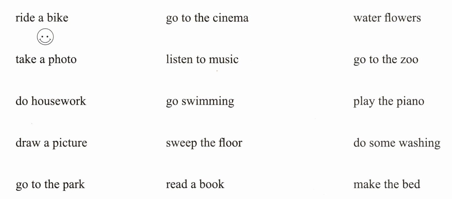 答案:示例:在“ride a bike” “listen to music” “go swimming” “read a book”下画上笑脸(实际答案需根据个人真实经历选择并标注)