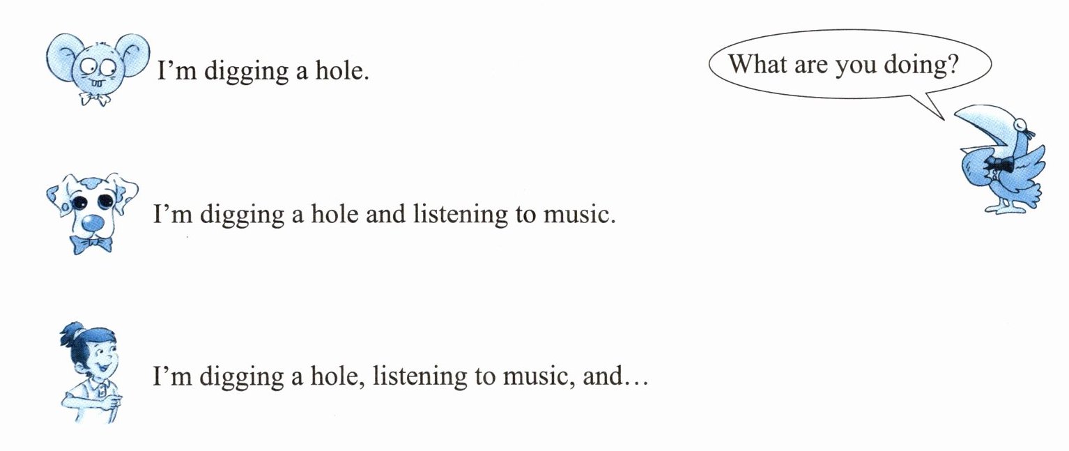 答案:示例:I'm digging a hole, listening to music, and singing a song.