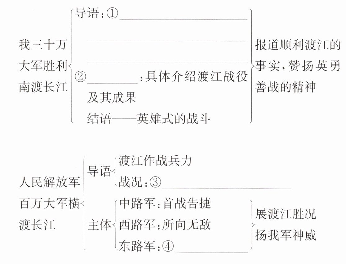 答案:①英勇的人民解放军二十一日已有大约三十万人渡过长江 ②主体 ③冲破敌阵,横渡长江 ④战绩辉煌