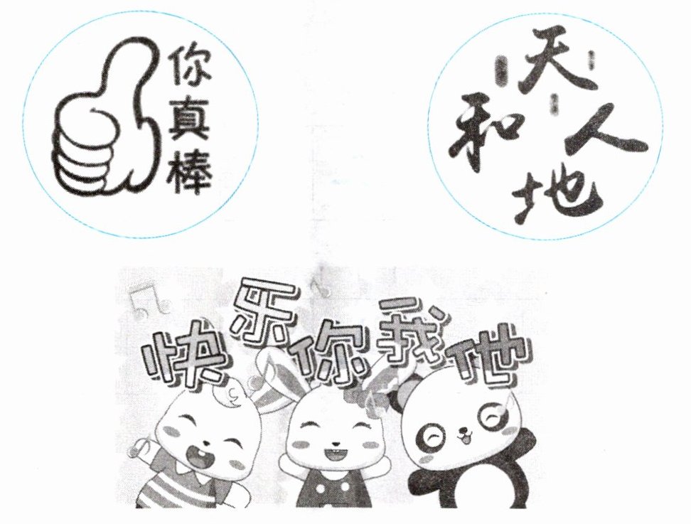 答案:圈出左边竖排文字“你真棒”中的“你”;圈出右边文字“天、人、和、地”中的“天”“地”“人”;圈出下方文字“快乐你我他”中的“你”“我”“他”。
