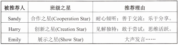 解析:首先介绍推荐Sandy为合作之星,列出其耐心倾听、善于交流、乐于分享的理由;接着推荐Harry为创新之星,说明其见解独特、敢于尝试、思维活跃;然后对Emily的展示之星理由进行合理发挥,补充她大声发言能让大家听清、不害怕展示自己、自信表达等内容,使理由更充分。整体语句通顺,符合词数要求,涵盖所有要点。