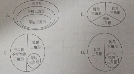 解析:三角形按角分类可分为锐角三角形、直角三角形、钝角三角形,它们是并列关系,而D选项中锐角三角形包含在直角三角形里,分类错误,故选D。