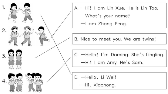 3. (图片:两个长得一样的小朋友) C. —Hello! I’m Daming. She’s Lingling. —Hi! I am Amy. He’s Sam.