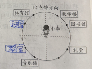答案:(1)11 (2)2 (3)图书馆 (4)音乐楼 (5)(画图)10点方向标足球场,8点方向标医务室