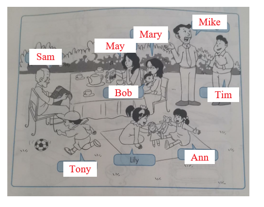 This is my family. Look, my grandfather is reading the newspaper. His name is Sam. A boy is playing football beside him. That is me. My name is Tony. My mother likes to listen to music. Her name is May. My aunt, Mary, is beside her. My father and my uncle are talking. My father is tall. His name is Mike. My uncle, Tim, is a very kind man. He is a little fat. My sister Lily and my cousin Ann are playing with toys. They are so happy. Where is Ann's little brother Bob? Can you find him?