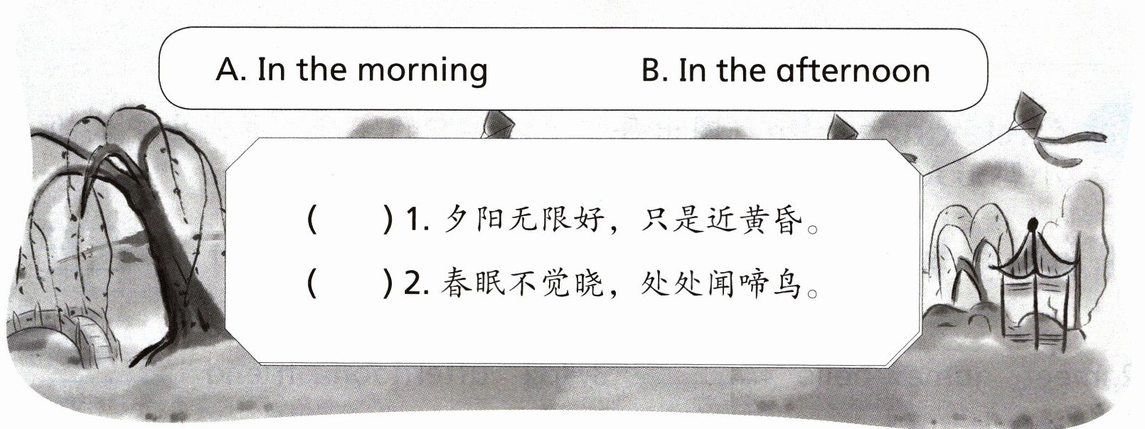 解析:“春眠不觉晓,处处闻啼鸟。”描述的是早晨的景象,对应“In the morning”。
