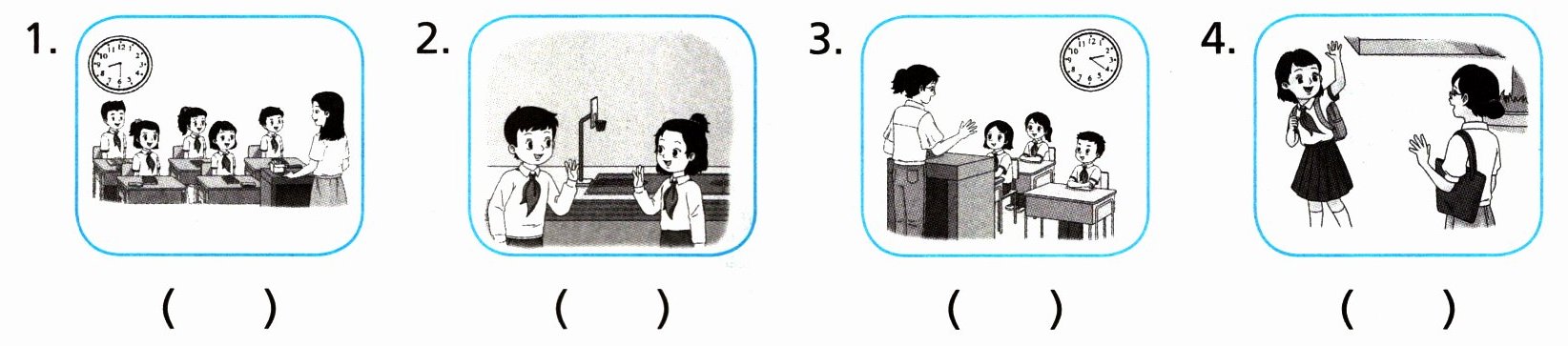 解析:图片3钟表显示下午,老师和学生在教室,应是下午上课打招呼,A选项“—Good afternoon, class. —Good afternoon, Miss Ma.”(—下午好,同学们。—下午好,马老师。)符合。