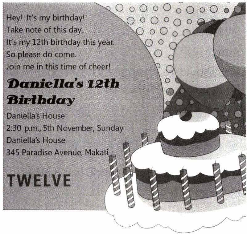 答案:1 It's Daniella's. 2 She's twelve. 3 It's on the fifth of November. 4 It starts at 2:30 p.m. 5 It is at Daniella's house.
