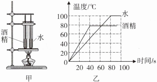4.(1304)在比较酒精和水的比热容大小的实验中,用图甲装置对相同质量的酒精和水进行加热,得到图乙的温度随时间变化的图线。则下列说法中正确的是(