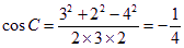 ∵,∴由正弦定理可得:a:b:c=3:2:4,又∵△ABC的周长为9,∴可设三角形三边长分别为3k,2k,4k,得:3k+2k+4k=9,解得k=1,∴△ABC中,a=3,b=2,c=4,∴由余弦定理可得:。