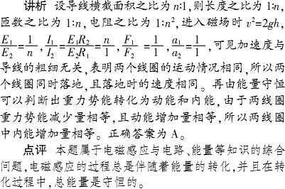 用同样的材料、不同粗细导线绕成两个质量面积均相同的正方形线圈Ⅰ和Ⅱ,使它们从离有理想界面的匀强磁场高度为h的地方同时自由下落,如图2所示.线圈平面与磁感线垂直,空气阻力不计,则 [ ]