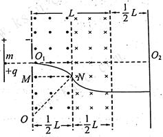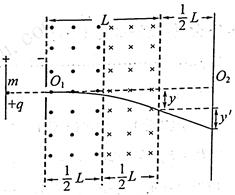 如图所示,质量为m带电量为+q的带电粒子(不计重力),从左极板处由静止开始经电压为U的加速电场加速后,经小孔O1进入宽为L的场区,再经宽为L的无场区打到荧光屏上。O2是荧光屏的中心,连线O1O2与荧光屏垂直。第一次在宽为L整个区域加入电场强度大小为E、方向垂直O1O2竖直向下的匀强电场;第二次在宽为L区域加入宽度均为L的匀强磁场,磁感应强度大小相同、方向垂直纸面且相反。两种情况下带电粒子打到荧光屏的同一点。求: