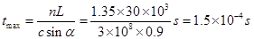 如图所示,AB为一长L=30 km的光导纤维,一束光线从端面A射入,在侧面发生全反射,最后从B端面射出.已知光导纤维的折射率n=1.35,光线从纤维内侧面向外射出时,临界角的正弦值为0.9,设在侧面发生全反射的光线从A端传播到B端所需时间为t,则下列说法正确的是( )