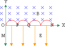 (1)粒子由静止释放一定要先受电场力作用(磁场对静止电荷没有作用力),所以M点要在-Y轴上.要进入磁场必先向上运动,静上的电荷要向上运动必须受到向上的电场力作用,而场强E方向是向下的,所以粒子带负电. (2)粒子在M点受向上电场力,从静止出发做匀加速运动.在O点进入匀强磁场后,只受洛仑兹力(方向沿+X轴)做匀速周围运动,经半个周期,回到X轴上的P点,进入匀强电场,在电场力作用下做匀减速直线运动直到速度为零.然后再向上做匀加速运动,在X轴上P点进入匀强磁场,做匀速圆运动,经半个周期回到X轴上的Q点,进入匀强电场,再在电场力作用下做匀减速运动直到速度为零.此后,粒子重复上述运动直到X轴上的N点,运动轨迹如图所示.