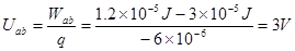 将电量为-6×10-6C的电荷从电场中A点移到B点,克服电场力做了3×10-5J的功,则该电荷在此过程中电势能增加了                J;再将该电荷从B点移到C点,电场力做了1.2×10-5J的功,则A、C间的电势差UAC=             。