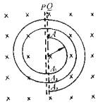 如图所示,相距为d的狭缝P、Q间存在着一匀强电场,电场强度为E,但方向按一定规律变化(电场方向始终与P、Q平面垂直)。狭缝两侧均有磁感强度大小为B、方向垂直纸面向里的匀强磁场区,其区域足够大。某时刻从P平面处由静止释放一个质量为m、带电量为q的带负电粒子(不计重力),粒子被加速后由A点进入Q平面右侧磁场区,以半径r1作圆周运动,并由A1点自右向左射出Q平面,此时电场恰好反向,使粒子再被加速而进入P平面左侧磁场区,作圆周运动,经半个圆周后射出P平面进入PQ狭缝,电场方向又反向,粒子又被加速……以后粒子每次到达PQ狭缝间,电场都恰好反向,使得粒子每次通过PQ间都被加速,设粒子自右向左穿过Q平面的位置分别是A1、A2、A3……An……粒子第一次在Q右侧磁场区作圆周运动的半径r1多大?