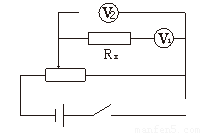 | 待测电阻Rx 电源E 电压表V1 电压表V2 电流表A 滑动变阻器R 开关S、导线若干 |