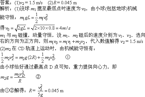 如图,一光滑水平桌面AB与一半径为R的光滑半圆形轨道相切于C点,且两者固定不动.一长L为0.8m的细绳,一端固定于O点,另一端系一个质量m1为0.2kg的球.当球在竖直方向静止时,球对水平桌面的作用力刚好为零.现将球提起使细绳处于水平位置时无初速释放.当球m1摆至最低点时,恰与放在桌面上的质量m2为0.8kg的小铁球正碰,碰后m1小球以2m/s的速度弹回,m2将沿半圆形轨道运动,恰好能通过最高点D.g=10m/s2,求: