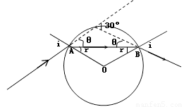 (9分)如图所示,在真空中波长为600 nm的激光束从A点射入圆柱形玻璃介质。若该激光束经折射后从B点射出,射出玻璃与射入玻璃的光线夹角为30°,AB孤所对的圆心角为120°,求该激光束在玻璃中的波长。