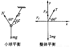 ⑵对整体受重力2mg、地面的支持力FN、静摩擦力Ff和绳的拉力T作用,如上图所示,并建立图示直角坐标系。
