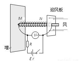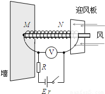 £¨12·Ö£©Ä³¿ÎÍâС×éÉè¼ÆÁËÒ»Öֲⶨ·çËÙµÄ×°Öã¬ÆäÔÀíÈçͼËùʾ£¬Ò»¸ö¾¢¶ÈϵÊýk=120N/m£¬×ÔÈ»³¤¶ÈL0=1mµÄµ¯»ÉÒ»¶Ë¹Ì¶¨ÔÚǽÉϵÄMµã£¬ÁíÒ»¶ËNÓëµ¼µçµÄÓ·ç°åÏàÁ¬£¬µ¯»É´©Ôڹ⻬ˮƽ·ÅÖõĵç×èÂʽϴóµÄ½ðÊô¸ËÉÏ£¬µ¯»ÉÊDz»µ¼µçµÄ²ÄÁÏÖÆ³ÉµÄ¡£Ó·ç°åÃæ»ýS=0.5m2£¬¹¤×÷ʱ×ÜÊÇÕý¶Ô×Å·ç´µÀ´µÄ·½Ïò¡£µç·µÄÒ»¶ËÓëÓ·ç°åÏàÁ¬£¬ÁíÒ»¶ËÔÚMµãÓë½ðÊô¸ËÏàÁ¬¡£Ó·ç°å¿ÉÔÚ½ðÊô¸ËÉÏ»¬¶¯£¬ÇÒÓë½ðÊô¸Ë½Ó´¥Á¼ºÃ¡£¶¨Öµµç×èR=1.0¦¸£¬µçÔ´µÄµç¶¯ÊÆE=12V£¬ÄÚ×èr=0.5¦¸¡£±ÕºÏ¿ª¹Ø£¬Ã»Óз紵ʱ£¬µ¯»É´¦ÓÚÔ³¤£¬µçѹ±íµÄʾÊýU1=9.0V£¬Ä³Ê±¿ÌÓÉÓÚ·ç´µÓ·ç°å£¬µçѹ±íµÄʾÊý±äΪU2=6.0V¡££¨µçѹ±í¿É¿´×÷ÀíÏë±í£©Çó£º