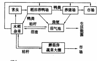 26.(16分)下图是我国南方开始尝试的农业生态系统的结构模式图,它利用雏鸭旺盛的杂食性,吃掉稻田里的杂草和害虫,用作物养猪、养鸭,用秸秆培育蘑菇、生产沼气,猪鸭粪、沼渣肥田。请据图回答: