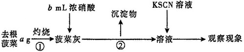 Ⅲ.将菠菜在少量开水中煮沸 ,冷却后滤去菠菜,得滤液。向滤液中加入足量 溶液,然后再加入足量试剂X,观察现象。 请回答以下问题: (1)操作①中使用的仪器除三角架、酒精灯、玻璃棒外还需要____________操作②的名称是________________;