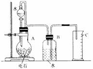 (1) ;B贮水,以使烧瓶A中产生的 进入B时,排出与它等体积的水进入量筒。C测定乙炔的体积;防止电石与残留的水或水汽作用产生的乙炔逸散到大气中。