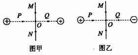 21.甲乙两图分别表示两个等量正电荷和两个等量异号电荷的电场,O为两电荷连线的中点,P、Q是连线上关于O对称的两点,M、N为连线中垂线上关于O对称的两点,若带电量为-q的粒子在电气中仅受电场力作用,则 ( )