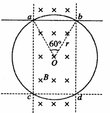 18.垂直于纸面的匀强磁场区域宽度为d,一个电子以速度v沿图示方向垂直磁场方向及磁场边界射入该区域,恰好不能飞过场区。采取如下哪些方法,可能使该电子飞到场区右侧 ( )