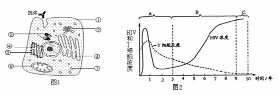 30、(16分)图1表示某淋巴细胞,膜外颗粒为抗体;图2表示HIV感染人体后,体液中HIV浓度和人体内主要的免疫细胞―T细胞数量的变化过程。请回答:
