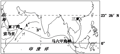 。(2分) (3)舰艇经过马六甲海峡时,风浪较 (大或小),其主要原因是:(2分) (4)图中正确表示该季节洋流流向的是 (A或B),其成因是:(2分) (5)经过亚丁湾、索马里海域的船只装运的大宗物资最主要的是 , 世界上该物资的最大输出地是 。(2分)