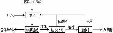 试回答下列问题: ⑴Mn2O3氧化甲苯的反应需要不断搅拌,搅拌的作用是______________。 ⑵甲苯经氧化后得到的混合物通过结晶、过滤进行分离。该过程中需将混合物冷却,其目的是______________。 ⑶实验过程中,可循环使用的物质分别为_______、_______。 ⑷实验中分离甲苯和苯甲醛采用的操作Ⅰ是______________,其原理是______________。 ⑸实验中发现,反应时间不同苯甲醛的产率也不同(数据见下表)。 反应时间/h 1 2 3 4 5 苯甲醛产率/%