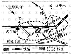 。 (2)图中C、D二处,分别设置了自来水 厂和钢铁厂,请判断是否合理? C ,D 。 (3)图中该城市交通线路的设置,最不合 理的是 。判断理由是