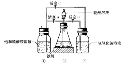 (3)利用容器②的反应,向容器①中通入氢气,应关闭活塞______,打开活塞_____ (填字母)。容器③中 溶液的作用是_________________________________;向容器①中通人氢气的目的是_____________________________________________。 Ⅱ.待锥形瓶中的铁屑快反应完时,关闭活塞B、C,打开活塞A,继续产生的氢气会将锥形瓶中的硫酸亚铁(含极少部分未反应的稀硫酸)压到饱和硫酸铵溶液的底部。在常温下放置一段时间,试剂瓶底部将结晶出硫酸亚铁铵。 硫酸亚铁与硫酸铵溶液混合就能得到硫酸亚铁铵晶体,其原因是______________;从容器①中分离并得到纯净硫酸亚铁铵晶体的操作方法是________、_____ 、___________。