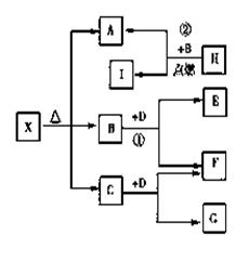 试回答下列问题: (1)G的电子式为:_____________。 (2)写出下列反应的化学方程式 ①________________________________ ②_______________________________ 。 (3)X在医药上用作解酸剂,与盐酸作用时,生成B的 物质的量与消耗盐酸的物质的量之比 为3∶8,则 X的化学式为:_____________