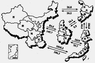 为推进区域经济均衡发展,国务院将我国分为中部、东北部、西部、东部四大地区,并提出了“中部崛起”、“东北振兴”、“西部开发”和“东部新跨越”的战略决策。 (1)在四大地区中,人口净流入量最大的是 地区,人口净流出量最大的是 地区。在四大地区中,相互之间人口流动总量最小的是