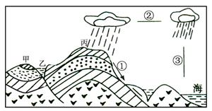 在图中②、③ 两处标出箭头,表示水汽运动方向,使它构成一个完整的海陆间循环;并写出序号所表示的水循环环节名称:①是 ;②是 ;③是