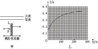 为了测定和描绘“220V40W”白炽电灯灯丝伏安特性曲线,可以利用调压变压器供电.调压变压器是一种自耦变压器,它只有一组线圈L,绕在闭合的环形铁芯上,输入端接在220V交流电源的火线与零线间,输出端有一个滑动触头P,移动它的位置,就可以使输出电压在0&250V之间连续变化,图甲中画出的是调压变压器的电路图符号.实验室内备有交流电压表、交流电流表、滑动变阻器、开关、导线等实验器材.