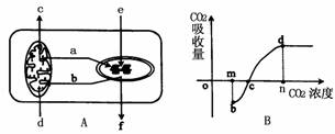A组 如图所示,图A表示某植物细胞的部分细胞结构和相关代谢情况,a~f指的是O2或CO2。图B表示在适宜的条件下,环境中的CO2浓度与CO2吸收量之间的关系曲线,m点是能够进行光合作用的CO2最低浓度。据图回答: