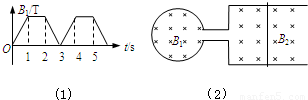 在水平桌面上,一个面积为S的圆形金属框置于匀强磁场中,线框平面与磁场垂直,磁感应强度B1随时间t的变化关系如图(1)所示.0~1s内磁场方向垂直线框平面向下.圆形金属框与一个水平的平行金属导轨相连接,导轨上放置一根导体棒,导体棒的长为L、电阻为R,且与导轨接触良好,导体棒处于另一匀强磁场中,其磁感应强度恒为B2,方向垂直导轨平面向下,如图(2)所示.若导体棒始终保持静止,则其所受的静摩擦力f随时间变化的图象是下图中的(设向右为静摩擦力的正方向)( )