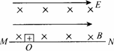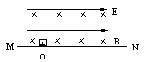 如图所示,在水平向右的匀强电场E和水平向里的匀强磁场B并存的空间中,有一个足够长的水平光滑绝缘面MN。面上O点处放置一个质量为m、带正电q的物块,释放后物块自静止开始运动。求物块刚要离开水平面时的速度和相对于出发点O的位移。