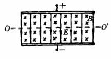 如图所示,真空中两水平放置的平行金属板间有电场强度为E的匀强电场,垂直场强方向有磁感应强度为B的匀强磁场,OO′为两板中央垂直磁场方向与电场方向的直线,以下说法正确的是[ ]