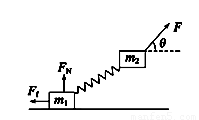 如图所示,质量分别为m1、m2的两个物体通过轻弹簧连接,在大小相等的两力F的作用下一起沿水平方向做匀速直线运动(m1在地面,m2在空中),斜向上的力F与水平方向成θ角,轻弹簧与水平方向成α角。则m1所受支持力