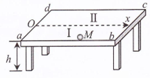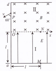 如图所示,水平光滑绝缘桌面距地面高h,x轴将桌面分为Ⅰ、Ⅱ两个区域。右图为桌面的俯视图,Ⅰ区域的匀强电场场强为E,方向与ab边及x轴垂直;Ⅱ区域的匀强磁场方向竖直向下。一质量为m,电荷量为q的带正电小球,从桌边缘ab上的M处由静止释放(M距ad边及x轴的距离均为l),加速后经x轴上N点进入磁场,最后从ad边上的P点飞离桌面;小球飞出的瞬间,速度如图与ad边夹角为60o。求:![]()