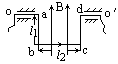 (5分)如图所示,一细导体杆弯成四个拐角均为直角的平面折线,其ab、cd段长度均为l1,bc段长度为l2.弯杆位于竖直平面内,Oa、段由轴承支撑沿水平放置.整个弯杆置于匀强磁场中,磁场方向竖直向上,磁感应强度为B.今在导体杆中沿abcd通以大小为I的电流,此时导体杆受到的安培力对O轴的力矩大小等于________。