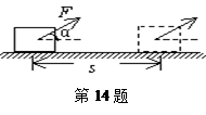 (12分)质量为1kg的物体静止在水平桌面上,物体受到一个与水平面成α=53°角的拉力F=5N的作用后由静止开始运动,已知物体与地面间的摩擦因数μ=0.25, sin530=0.8, cos530=0.6, g=10m/s², 求在距离2m内 :![]()